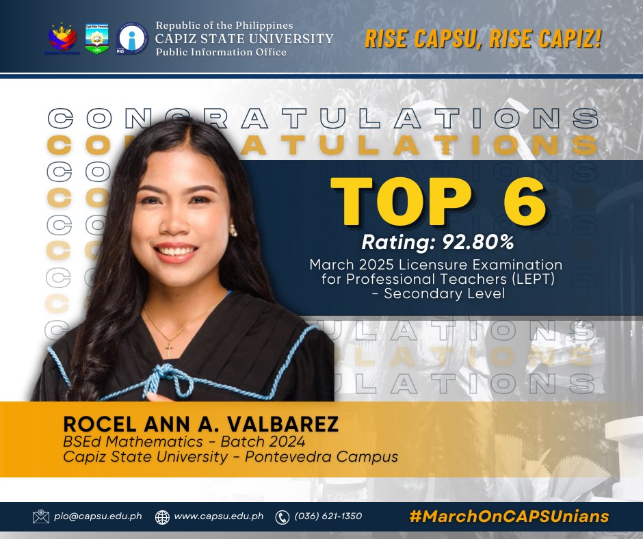 Rocel Ann A. Valbarez, a Bachelor of Secondary Education (BSEd) – Mathematics alumna of Capiz State University (CAPSU) – Pontevedra Campus, has secured 6th place in the March 2025 Licensure Examination for Professional Teachers (LEPT) – Secondary Level with a rating of 92.80%. Congratulations! Your CAPSU family is proud of you. @capsu pio