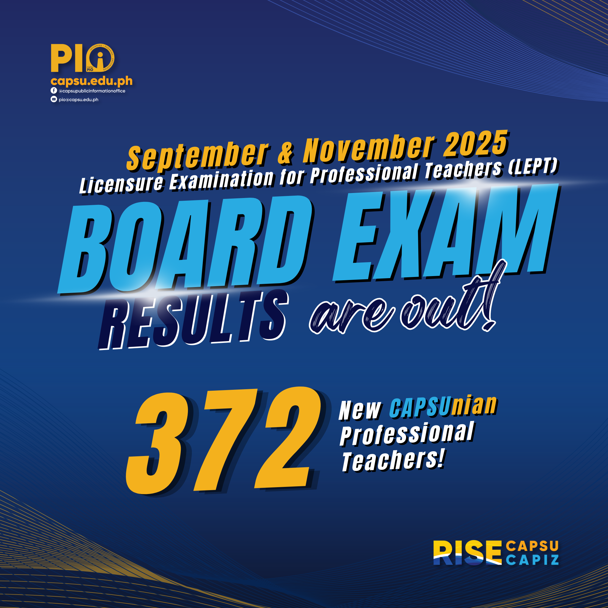 The Professional Regulation Commission (PRC) and the Board of Professional Teachers released on Thursday, December 18, the results of the September and November 2025 Licensure Examination for Professional Teachers (LEPT) for both Elementary and Secondary levels. As announced, 21,967 out of 43,035 (51.04%) examinees in the elementary level and 57,729 out of 79,493 (72.62%) examinees in the secondary continue reading : September and November 2025 LET Results: CAPSU produces 372 new professional teachers